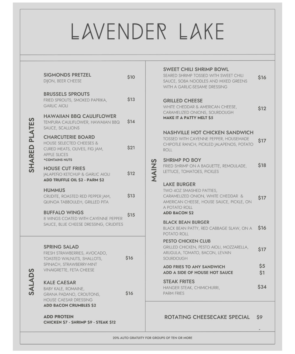 “ Overall really enjoyed my experience at Lavendar Lake. I stopped in with my partner to have a drink and ended up also grabbing the burger. Great selection of cocktails to chose from as well as bar food. The burger was delicious. Only reason I’m not giving a 5/5 is because the service has room to improve. ”